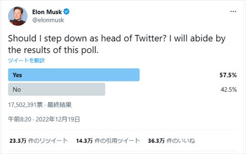 同氏は先日、「私はTwitterのトップを辞任するべきか」とTwitter上でアンケートを取り、賛成が57.5%を占めました。