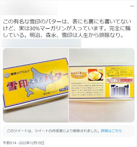 当該の投稿は、雪印北海道バターの写真とともに、「表にも裏にも書いてないけど、実は30%マーガリンが入っています。完全に騙している」と投稿。「人生から排除」と不買を促すような言葉も含まれています。