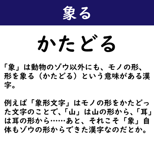 「象」は動物のゾウ以外にも、モノの形、形を象る(かたどる)という意味がある漢字。例えば「象形文字」はモノの形をかたどった文字のことで、「山」は山の形から、「耳」は耳の形から……あと、それこそ「象」自体もゾウの形からできた漢字なのだとか。