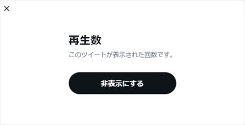 なお、この変更に関連して「非表示ボタン」というワードもトレンド入りしています。表示回数のアイコンをタップすると「このツイートが表示された回数です」というポップアップが表示され、「非表示にする」というボタンが添えられています。このボタンはポップアップを非表示にするもので、残念ながらツイートの表示回数は非表示にはできません。