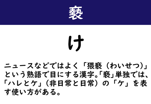 ニュースなどではよく「猥褻(わいせつ)」という熟語で目にする漢字。「褻」単独では、「ハレとケ」(非日常と日常)の「ケ」を表す使い方がある。