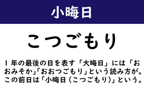 1年の最後の日を表す「大晦日」には「おおみそか」「おおつごもり」という読み方が。この前日は「小晦日(こつごもり)」という。