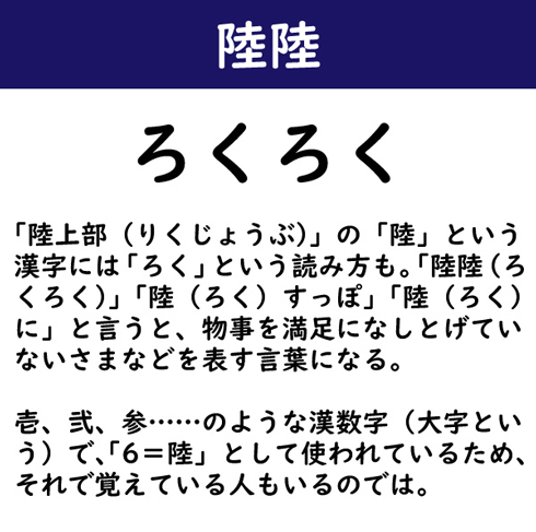 「陸上部(りくじょうぶ)」の「陸」という漢字には「ろく」という読み方も。「陸陸(ろくろく)」「陸(ろく)すっぽ」「陸(ろく)に」と言うと、物事を満足になしとげていないさまなどを表す言葉になる。壱、弐、参……のような漢数字(大字という)で、「6=陸」として使われているため、それで覚えている人もいるのでは。
