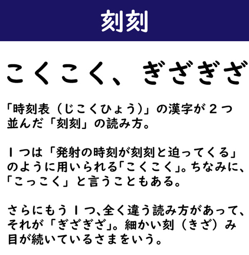 「時刻表(じこくひょう)」の漢字が2つ並んだ「刻刻」の読み方。1つは「発射の時刻が刻刻と迫ってくる」のように用いられる「こくこく」。ちなみに、「こっこく」と言うこともある。さらにもう1つ、全く違う読み方があって、それが「ぎざぎざ」。細かい刻(きざ)み目が続いているさまをいう。