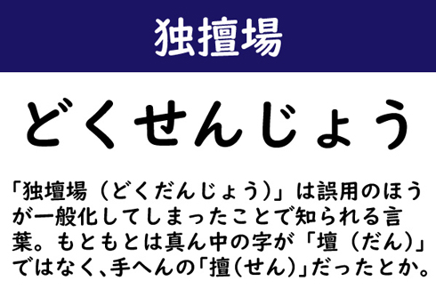 「独壇場(どくだんじょう)」は誤用のほうが一般化してしまったことで知られる言葉。もともとは真ん中の字が「壇(だん)」ではなく、手へんの「擅(せん)」だったとか。