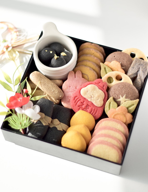 真ん中には十二支のウサギをモチーフにしただるまクッキーが。かわいさがぎゅっと詰まったお菓子のおせちは、お祝いにぴったりですね。