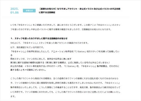 偽アカウントは、アニメ制作会社「C-Station」のスタッフを名乗って投稿し、ファンを見学会や忘年会に誘ったり、第3期に関する虚偽の情報を拡散したり、非公式の色紙・イラストなどを配布したりしているとのこと。これらいずれのケースも、C-Station、「ゆるキャン△」製作委員会、それぞれに属する個人とも一切関係ないとしています。