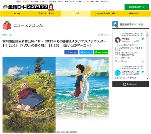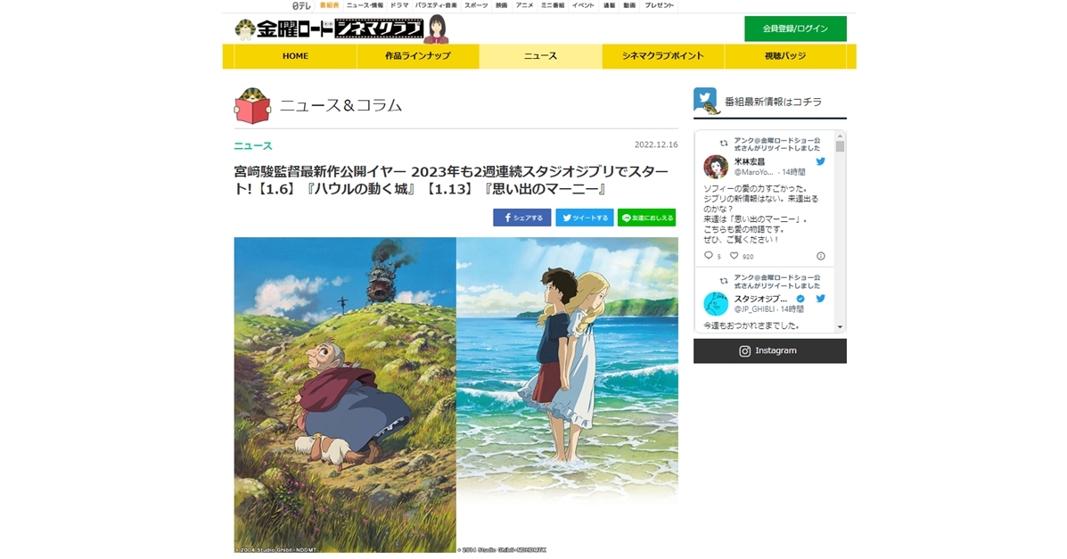 金曜ロードショーではスタジオジブリ作品「思い出のマーニー」を1月13日に放送予定。
