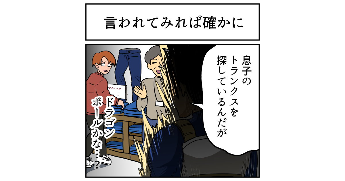ある日、ユニクロで店員さんに「息子のトランクスを探しているんだが」と話しかけるおじさんを見つけたというガナドウさん。普通なら子どもの洋服を買いに来たのか……と思うところですが、ガナドウさんは「ベジータの可能性あるな」と思ったそうです。確かに、マンガファンなら名作「ドラゴンボール」のキャラクターを思い出してもおかしくありません。でもベジータなら人に聞くまでもなく“気”で位置を探れそう。