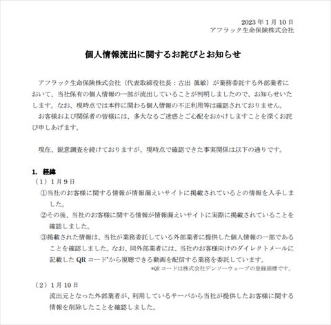 アフラックは、9日に顧客情報が情報漏えいサイトに掲載されているとの情報を入手し、実際に掲載されていることを確認したと説明しています。業務を委託している外部業者が利用しているサーバに不正なアクセスがあった可能性があるとのこと。このサーバから既に顧客情報は削除されているとしています。
