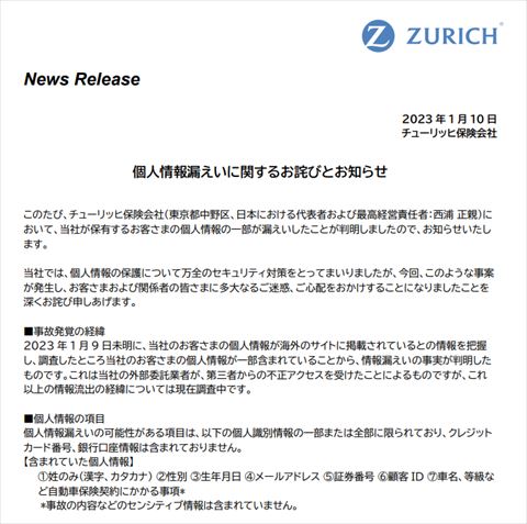 チューリッヒ保険会社も、外部委託業者が第三者からの不正アクセスを受け、顧客情報が流出したと説明。「スーパー自動車保険」の過去または現在の加入者のうち最大75万7463人が対象としています。流出したのは姓、性別、生年月日、メールアドレス、証券番号、顧客ID、車名、等級など。個人情報が漏えいした可能性のある顧客には個別に連絡するとしています。