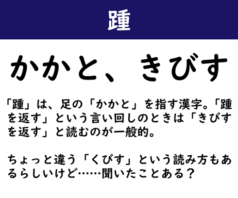 「踵」は、足の「かかと」を指す漢字。「踵を返す」という言い回しのときは「きびすを返す」と読むのが一般的。ちょっと違う「くびす」という読み方もあるらしいけど……聞いたことある?