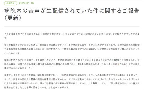 問題が発生したのは1月7日午後で、医師の私用スマホのアプリを介して、救急外来診察や発熱外来などの診察時の音声(会話)の一部が配信され、不特定多数のアプリ利用者が聞ける状態となっていました。配信時間は同日13時19分から計1時間37分間で、8人の患者の氏名などの情報が含まれていたといいます。