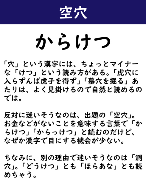 「穴」という漢字には、ちょっとマイナーな「けつ」という読み方がある。「虎穴に入らずんば虎子を得ず」「墓穴を掘る」あたりは、よく見掛けるので自然と読めるのでは。反対に迷いそうなのは、出題の「空穴」。お金などがないことを意味する言葉で「からけつ」「からっけつ」と読むのだけど、なぜか漢字で目にする機会が少ない。ちなみに、別の理由で迷いそうなのは「洞穴」。「どうけつ」とも「ほらあな」とも読めちゃう。