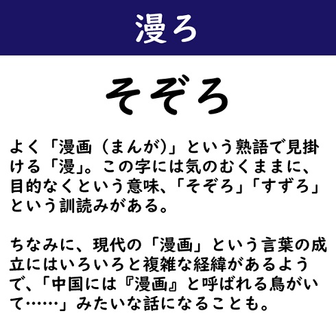 よく「漫画(まんが)」という熟語で見掛ける「漫」。この字には気のむくままに、目的なくという意味、「そぞろ」「すずろ」という訓読みがある。ちなみに、現代の「漫画」という言葉の成立にはいろいろと複雑な経緯があるようで、「中国には『漫画』と呼ばれる鳥がいて……」みたいな話になることも。