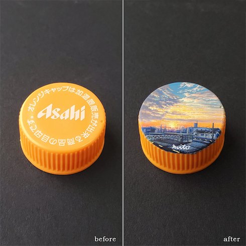 キャップ本来の色を生かした青空と夕暮れのグラデーションや、緻密に描かれた街並みを見ていると、まるで小さな世界をのぞきこんでいるような気分に。ペットボトルキャップというありふれたものの中に、ただ1つの特別な景色を見せてくれるすてきな作品です。