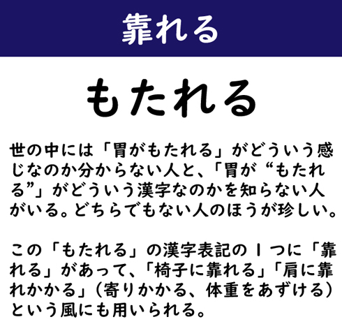 世の中には「胃がもたれる」がどういう感じなのか分からない人と、「胃が“もたれる”」がどういう漢字なのかを知らない人がいる。どちらでもない人のほうが珍しい。この「もたれる」の漢字表記の1つに「靠れる」があって、「椅子に靠れる」「肩に靠れかかる」(寄りかかる、体重をあずける)という風にも用いられる。