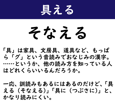 「具」は家具、文房具、道具など、もっぱら「グ」という音読みでおなじみの漢字。……というか、他の読み方を知っている人はどれくらいいるんだろうか。一応、訓読みもあるにはあるのだけど、「具える(そなえる)」「具に(つぶさに)」と、かなり読みにくい。