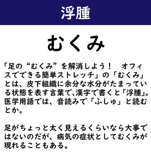 「足の“むくみ”を解消しよう! オフィスでできる簡単ストレッチ」の「むくみ」とは、皮下組織に余分な水分がたまっている状態を表す言葉で、漢字で書くと「浮腫」。医学用語では、音読みで「ふしゅ」と読むとか。足がちょっと太く見えるくらいなら大事ではないのだが、病気の症状としてむくみが現れることもある。