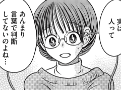 アスクミ先生はまず「人ってあんまり言葉で判断してないのよね」と、言います。言葉を話さなくても猫の鳴き声と態度で感情が分かるのと同じで、人間も態度や口調でまず判断します。例えば、言葉では「すみませんでした」と言っていても、目線がどこかに行ってたら信用できません。