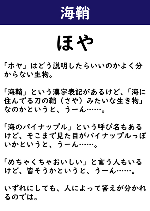 「ホヤ」はどう説明したらいいのかよく分からない生物。「海鞘」という漢字表記があるけど、「海に住んでる刀の鞘(さや)みたいな生き物」なのかというと、うーん……。「海のパイナップル」という呼び名もあるけど、そこまで見た目がパイナップルっぽいかというと、うーん……。「めちゃくちゃおいしい」と言う人もいるけど、皆そうかというと、うーん……。いずれにしても、人によって答えが分かれるのでは。