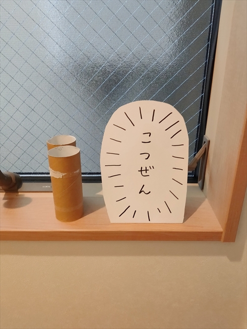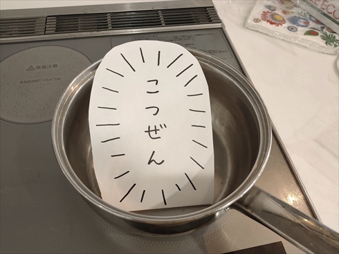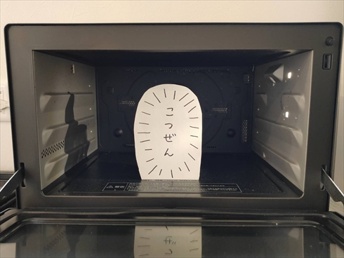 紙には「こつぜん」の文字と、それを囲む集中線が描き込まれています。投稿された4枚の写真では、この紙が電子レンジの中やトイレのトイレットペーパーの補充置き場、鍋の中に設置されています。絶妙に“何が”そこにあったかまで伝わってくる場面のチョイスも合わさり、なんとも言えない喪失感が味わえます。