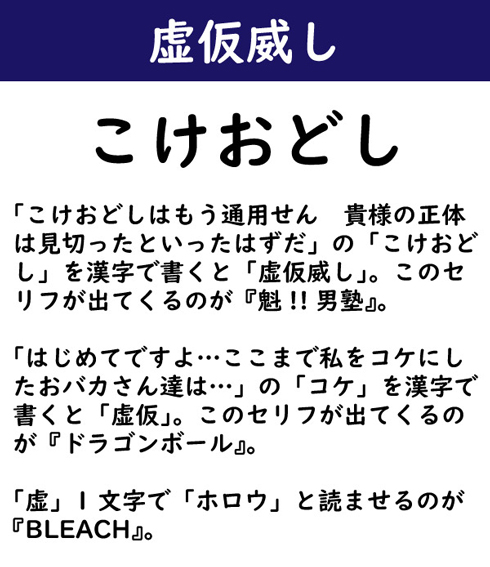 「こけおどしはもう通用せん 貴様の正体は見切ったといったはずだ」の「こけおどし」を漢字で書くと「虚仮威し」。このセリフが出てくるのが『魁!!男塾』。「はじめてですよ…ここまで私をコケにしたおバカさん達は…」の「コケ」を漢字で書くと「虚仮」。このセリフが出てくるのが『ドラゴンボール』。「虚」1文字で「ホロウ」と読ませるのが『BLEACH』。