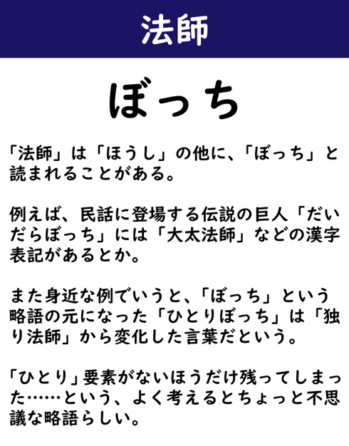 「法師」は「ほうし」の他に、「ぼっち」と読まれることがある。例えば、民話に登場する伝説の巨人「だいだらぼっち」には「大太法師」などの漢字表記があるとか。また身近な例でいうと、「ぼっち」という略語の元になった「ひとりぼっち」は「独り法師」から変化した言葉だという。「ひとり」要素がないほうだけ残ってしまった……という、よく考えるとちょっと不思議な略語らしい。