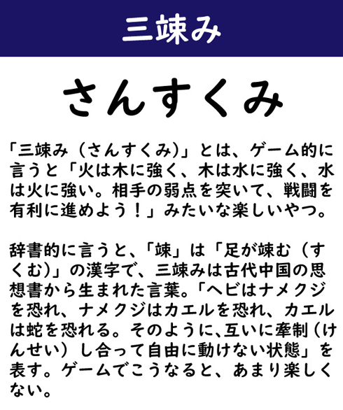 「三竦み(さんすくみ)」とは、ゲーム的に言うと「火は木に強く、木は水に強く、水は火に強い。相手の弱点を突いて、戦闘を有利に進めよう!」みたいな楽しいやつ。辞書的に言うと、「竦」は「足が竦む(すくむ)」の漢字で、三竦みは古代中国の思想書から生まれた言葉。「ヘビはナメクジを恐れ、ナメクジはカエルを恐れ、カエルは蛇を恐れる。そのように、互いに牽制(けんせい)し合って自由に動けない状態」を表す。ゲームでこうなると、あまり楽しくない。