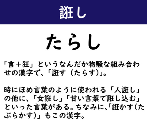 「言+狂」というなんだか物騒な組み合わせの漢字で、「誑す(たらす)」。時にほめ言葉のように使われる「人誑し」の他に、「女誑し」「甘い言葉で誑し込む」といった言葉がある。ちなみに、「誑かす(たぶらかす)」もこの漢字。