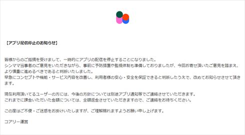 coary運営元は28日、「皆様からのご指摘を受けまして、一時的にアプリの配信を停止することになりました」と発表。「シンママ当事者のご意見をいただきながら、事前に予防措置や監視体制も準備しておりましたが、今回お寄せ頂いたご意見を踏まえ、より慎重に進めるべきであると判断いたしました」