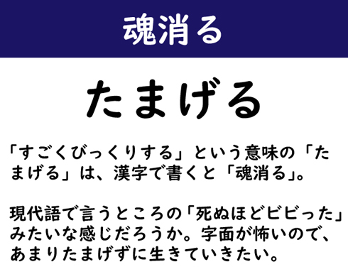 「すごくびっくりする」という意味の「たまげる」は、漢字で書くと「魂消る」。現代語で言うところの「死ぬほどビビった」みたいな感じだろうか。字面が怖いので、あまりたまげずに生きていきたい。
