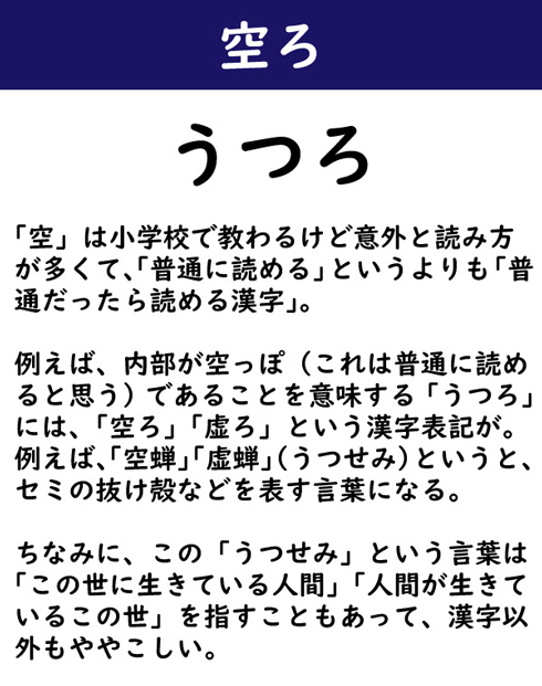 「空」は小学校で教わるけど意外と読み方が多くて、「普通に読める」というよりも「普通だったら読める漢字」。例えば、内部が空っぽ(これは普通に読めると思う)であることを意味する「うつろ」には、「空ろ」「虚ろ」という漢字表記が。例えば、「空蝉」「虚蝉」(うつせみ)というと、セミの抜け殻などを表す言葉になる。ちなみに、この「うつせみ」という言葉は「この世に生きている人間」「人間が生きているこの世」を指すこともあって、漢字以外もややこしい。