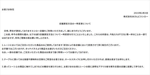 理由については「昨今の情勢を鑑み」と説明。最近SNSでは、スシロー店舗で顧客がしょうゆの容器をなめる、唾を付けた指で寿司に触るなどの迷惑行為を行う動画が拡散していました(関連記事)。