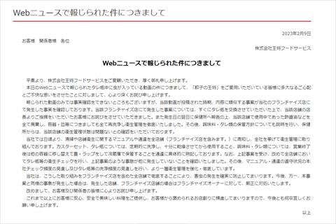 王将フードサービスは2月9日、「餃子の王将」でタレの瓶に虫が入っている動画が投稿されているとの報道を受けて、フランチャイズ店で類似の事案が発生したとして謝罪しました