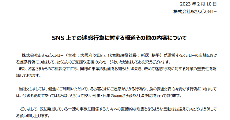 スシローをめぐっては先日から、利用客が醤油さしをなめる動画や甘だれに醤油を混ぜる動画がSNSで拡散されています。同社は、顧客相談窓口に同様の動画の連絡が寄せられているとして、あらためて迷惑行為に対する対策の重要性を認識しているとコメント。このような迷惑行為は「今後も絶対にあってはならない」として、刑事・民事の両面から毅然とした対応を行うとしています。