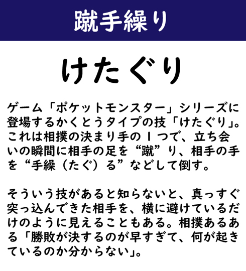 ゲーム「ポケットモンスター」シリーズに登場するかくとうタイプの技「けたぐり」。これは相撲の決まり手の1つで、立ち会いの瞬間に相手の足を“蹴”り、相手の手を“手繰(たぐ)る”などして倒す。そういう技があると知らないと、真っすぐ突っ込んできた相手を、横に避けているだけのように見えることもある。相撲あるある「勝敗が決するのが早すぎて、何が起きているのか分からない」。