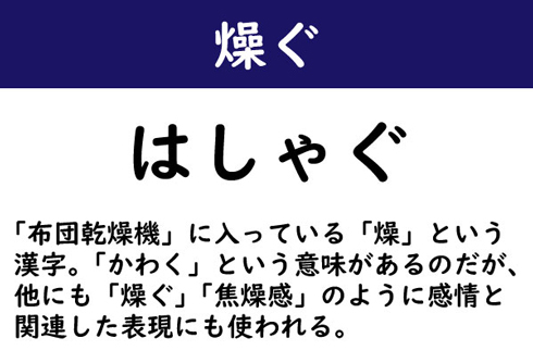 「布団乾燥機」に入っている「燥」という漢字。「かわく」という意味があるのだが、他にも「燥ぐ」「焦燥感」のように感情と関連した表現にも使われる。