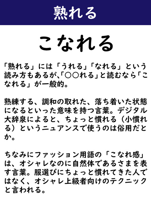 「熟れる」には「うれる」「なれる」という読み方もあるが、「○○れる」と読むなら「こなれる」が一般的。熟練する、調和の取れた、落ち着いた状態になるといった意味を持つ言葉。デジタル大辞泉によると、ちょっと慣れる(小慣れる)というニュアンスで使うのは俗用だとか。ちなみにファッション用語の「こなれ感」は、オシャレなのに自然体であるさまを表す言葉。服選びにちょっと慣れてきた人ではなく、オシャレ上級者向けのテクニックと言われる。
