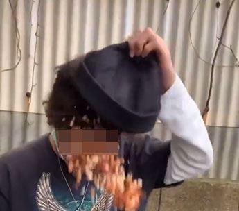 動画にはしゃぶ葉の駐車場で撮影されたものとみられ、2人の男性が登場。しゃぶ葉のドライフルーツを帽子に詰めたとする字幕が添えられています。男性の1人が帽子を脱ぐと、中からドライフルーツが地面に落ち、それを拾って食べる様子が写されています。