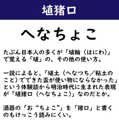 たぶん日本人の多くが「埴輪(はにわ)」で覚える「埴」の、その他の使い方。一説によると、「埴土(へなつち/粘土のこと)でできた盃が使い物にならなかった」という体験談から明治時代に生まれた表現が「埴猪口(へなちょこ)」なのだとか。酒器の「お“ちょこ”」を「猪口」と書くのもけっこう読みにくい。