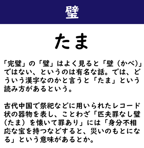 「完璧」の「璧」はよく見ると「壁(かべ)」ではない、というのは有名な話。では、どういう漢字なのかと言うと「たま」という読み方があるという。古代中国で祭祀などに用いられたレコード状の器物を表し、ことわざ「匹夫罪なし璧(たま)を懐いて罪あり」には「身分不相応な宝を持つなどすると、災いのもとになる」という意味があるとか。