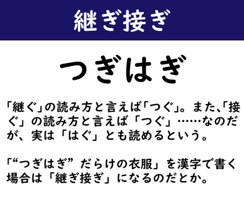 「継ぐ」の読み方と言えば「つぐ」。また、「接ぐ」の読み方と言えば「つぐ」……なのだが、実は「はぐ」とも読めるという。「“つぎはぎ”だらけの衣服」を漢字で書く場合は「継ぎ接ぎ」になるのだとか。