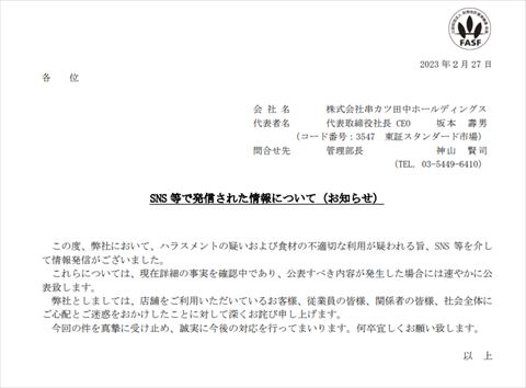 串カツ田中ホールディングスは「弊社において、ハラスメントの疑いおよび食材の不適切な利用が疑われる旨、SNS等を介して情報発信がございました」とし、「現在詳細の事実を確認中であり、公表すべき内容が発生した場合には速やかに公表致します」とコメント。誠実に今後の対応を行うと述べています。