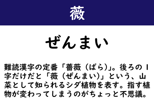難読漢字の定番「薔薇(ばら)」。後ろの1字だけだと「薇(ぜんまい)」という、山菜として知られるシダ植物を表す。指す植物が変わってしまうのがちょっと不思議。