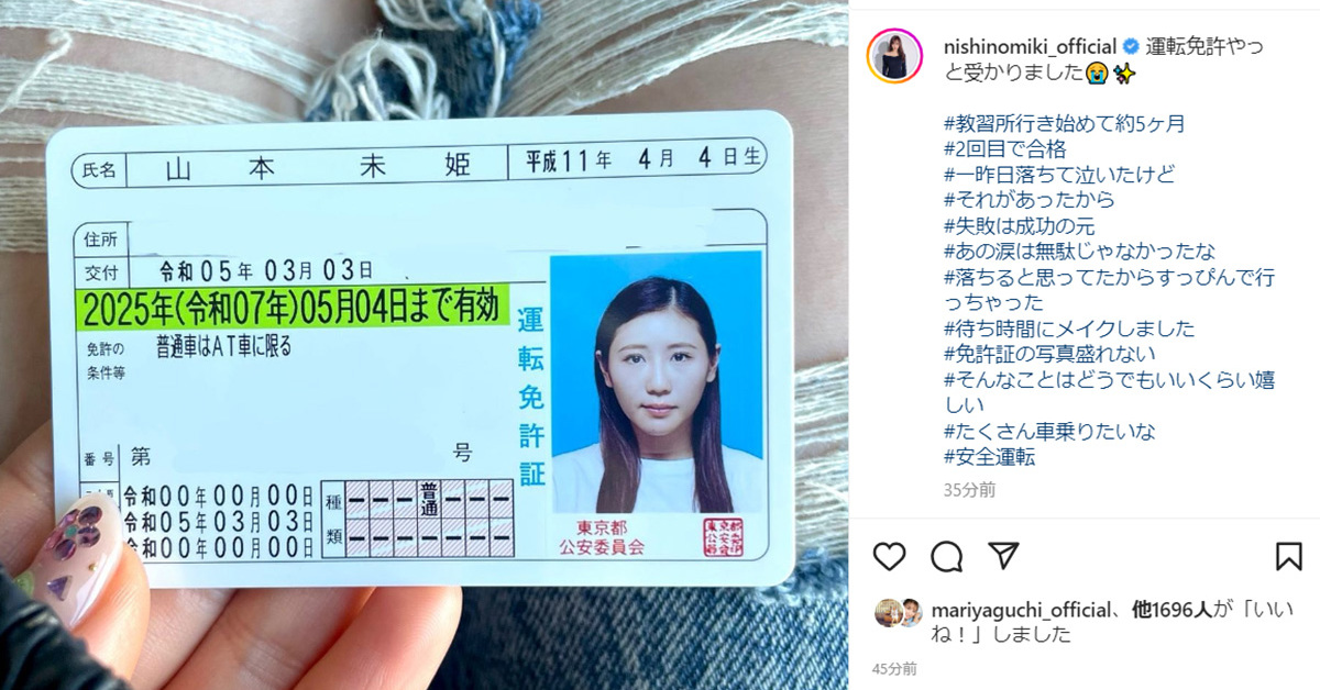 Instagramには、「山本未姫」の氏名が記された運転免許証とともに、「#免許証の写真盛れない」「#そんなことはどうでもいいくらいうれしい」「#たくさん車乗りたいな」「#安全運転」などのハッシュタグを添えて投稿。喜びを表現しつつ、交通ルール順守を誓いました。