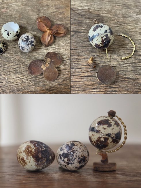 作者は、草花を使った工作や遊び方を教えている「New草花あそび研究所」のinori(@kusabanaasobi)さん。「ウズラの卵の柄が地図のようだった」という発想から生まれたこの作品は、茶色い色味とも相まって小さなアンティークのような味わい。それでいて実際の地球とは異なる模様から、まるで別の星の模型を見ているような気分にもなります。