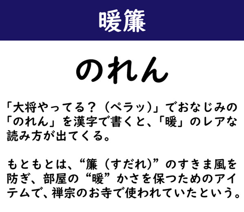 「大将やってる?(ペラッ)」でおなじみの「のれん」を漢字で書くと、「暖」のレアな読み方が出てくる。もともとは、“簾(すだれ)”のすきま風を防ぎ、部屋の“暖”かさを保つためのアイテムで、禅宗のお寺で使われていたという。