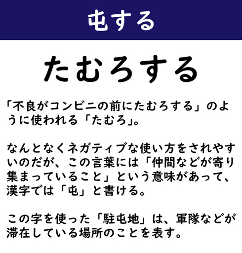「不良がコンビニの前にたむろする」のように使われる「たむろ」。なんとなくネガティブな使い方をされやすいのだが、この言葉には「仲間などが寄り集まっていること」という意味があって、漢字では「屯」と書ける。この字を使った「駐屯地」は、軍隊などが滞在している場所のことを表す。