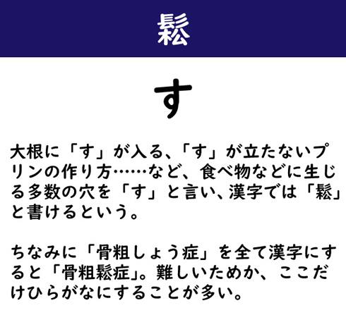 大根に「す」が入る、「す」が立たないプリンの作り方……など、食べ物などに生じる多数の穴を「す」と言い、漢字では「鬆」と書けるという。ちなみに「骨粗しょう症」を全て漢字にすると「骨粗鬆症」。難しいためか、ここだけひらがなにすることが多い。
